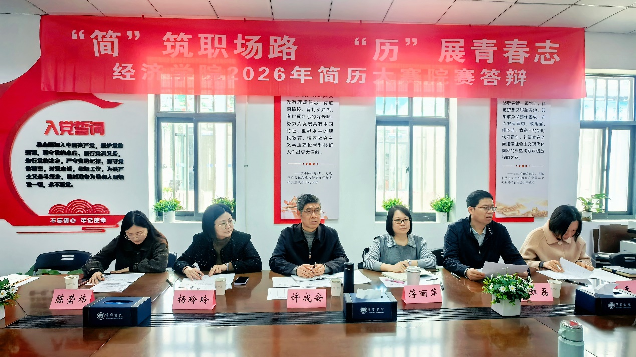 为帮助经院学子打磨求职“敲门砖”,提升简历制作与职业表达能力,经济学院组织开展简历大赛并于4月1日在泽园书院108会议室举行复赛答辩。本次答辩邀请校关工委委员、经济学院关工委常务副主任、经济学院“五老”工作室成员许成安,校党委巡察办专职副主任蒋丽萍,招生就业处就业指导科科长杨玲玲担任评审,经济学院党委副书记王红磊、研究生辅导员陈莹炜、本科生辅导员王丹共同参加指导。活动由经济学院学工办主任周丹主持。
